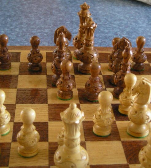 About the same time, I started playing Chess again at the Everett Chess Club, the Wizards of the Coast store chain (purchased by Hasbro) was taken out of the retail business and they had a big sell off of merchandise. I took advantage and bought at half price or better a nice large Wooden Staunton Set made in India with Walnut inlaid Board. Someday I would like to build a small table top to hold the board, and put it on the well turned legs of an old stool my wife has. Fine wooden sets can be gotten through The Chess Piece and I have other links below as well.