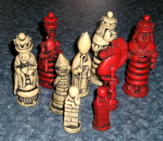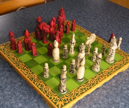Isle of Lewis Chessmen these are cast gypsum replicas purchased on Ebay and stained and painted myself. A future project might be a leather board, with celtic designs tooled into the white squares and around the borders!!