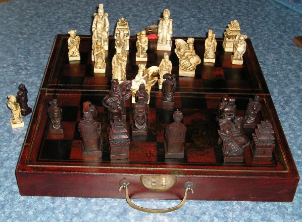Oriental set, with Chinese figures - a pseudo ivory figures stained purple and brown in board box. The bald headed bishops and the knights riding dragons are my favorite pieces. The Inlaid mother-of-pearl board I got from the Nile Shop in Cairo was just right to go with these chessmen.