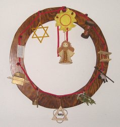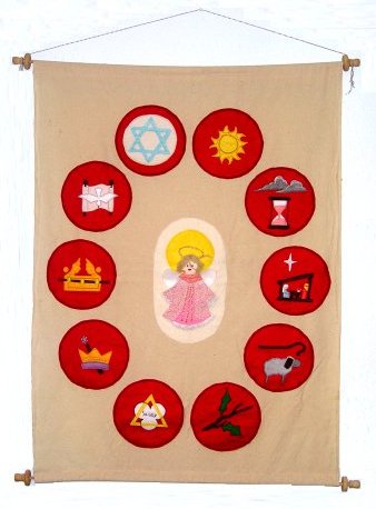 When our children were small, my wife wanted to establish a family tradtion at Christmas time. I crafted a series of Ornaments illustrating the prophecies of Christ's coming, and we wrapped them to be unwrapped, one each day, along with a Scripture reading and hung them along a red ribbon on the Christmas Tree. After a couple of years, we moved the ornaments from the Christmas Tree to the mantle of the fireplace and set aside a single candlelit evening each year to for all the readings, the hanging of the Ornaments, and the unpacking and arranging our Nativity scene, which my wife and I handpainted during a Illinois blizzard. Lacking a mantle, I have now made a special wooden "wreath" with pegs to hold the Ornaments which we hang above the piano during the holidays. Then we did a Banner for the church, using felt images of the various ornaments arranged in a oval.